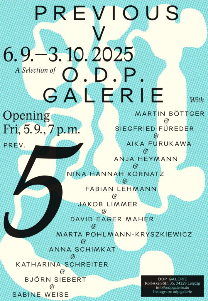 Veröffentlicht am September 2, 2025September 2, 2025PREVIOUS V, O.D.P. Galerie Opening 5.September 2025 , 19 Uhr in der O.D.P. Galerie with Martin Böttger Siegfried Füreder Aika Furukawa Anja Heymann Nina Hannah Kornatz Fabian Lehmann Jakob Limmer David Eager Maher Marta Pohlmann-Kryszkiewicz Anna Schimkat Katharina Schreiter Björn Siebert Sabine Weise