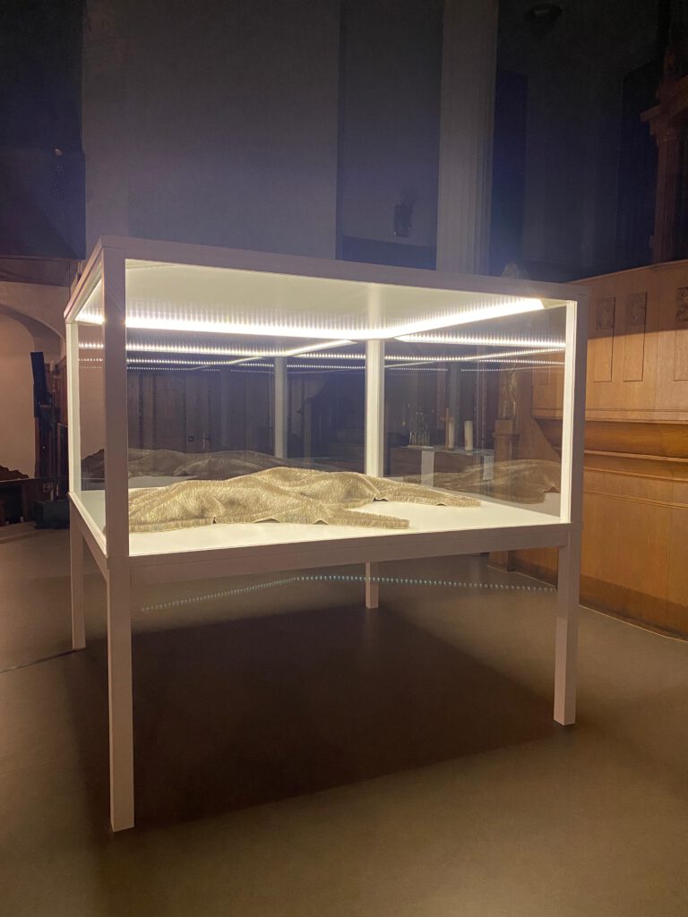 Doku kraj in der Philippuskirche Leipzig mit dem Objekt „Bär“ in Vitrine