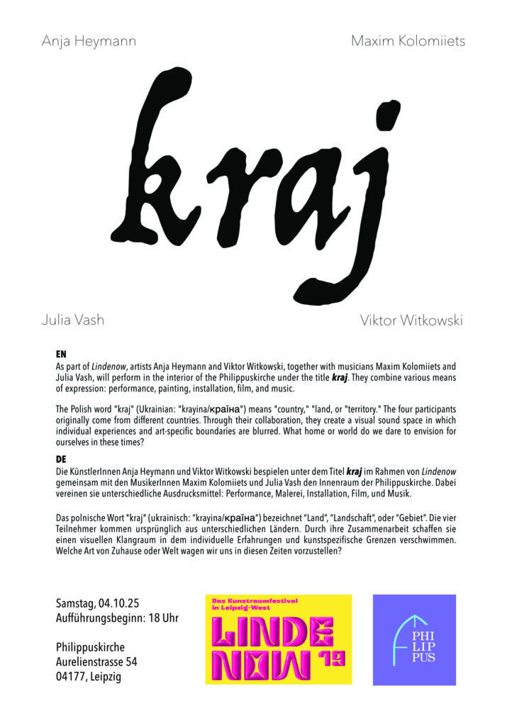 „Die KünstlerInnen Anja Heymann und Viktor Witkowski bespielen unter dem Titel „kraj“ im Rahmen von Lindenow gemeinsam mit den MusikerInnen Maxim Kolomiiets und Julia Vash den Innenraum der Philippuskirche. Dabei vereinen sie unterschiedliche Ausdrucksmittel: Performance, Malerei, Installation, Film, und Musik.